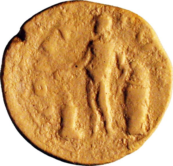 nude male figure (Genius of Patras) standing, facing, head, left, holding patera over altar, resting left arm on conical box which stands on base