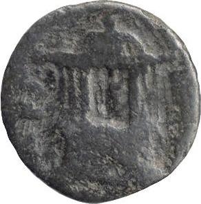 circular temple of Zeus with dome-shaped roof decorated with three eagles; building on base and with eight columns; inside, nude Zeus standing, facing, head, right, holding long sceptre, resting left arm on hip