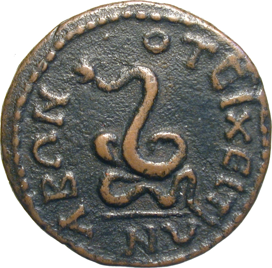 serpent with human face (Glykon?) coiling, left