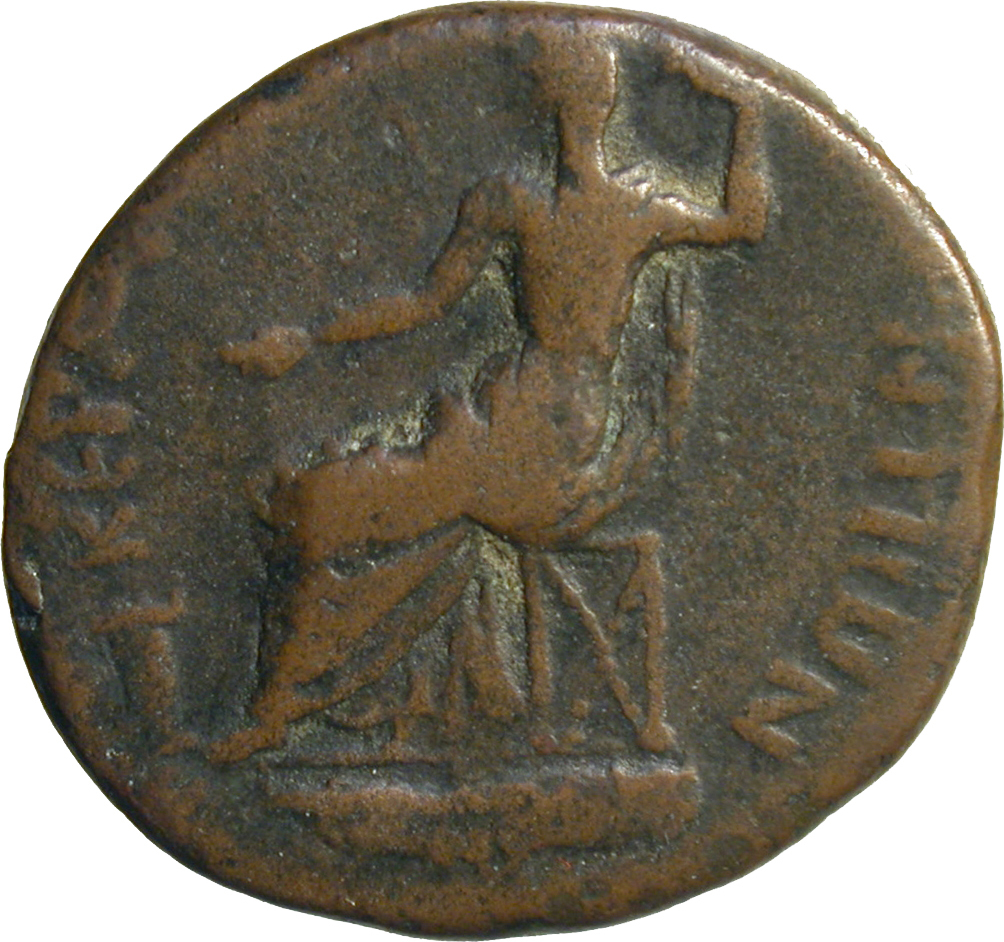 figure (Zeus or Tyche?) seated, left, holding round object (globe or patera?) over lighted altar and long sceptre