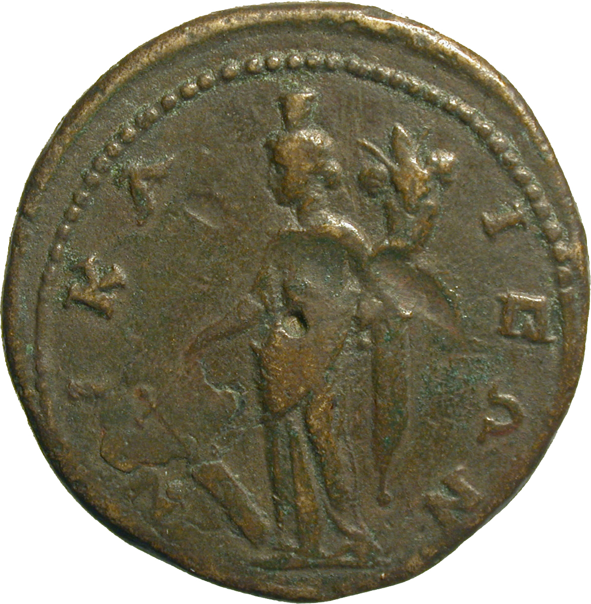 Tyche standing, left, wearing kalathos, holding rudder and cornucopia