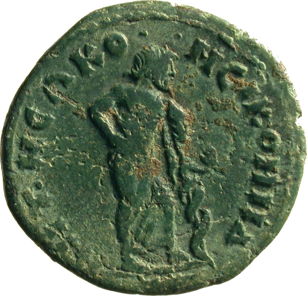 Asclepius standing, right, resting right hand on hip, resting on serpent-staff
