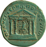 temple with four columns enclosing statue of figure seated, left, holding uncertain object and long sceptre