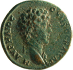 bare head of Marcus Aurelius (lightly bearded - short beard) with traces of drapery, right