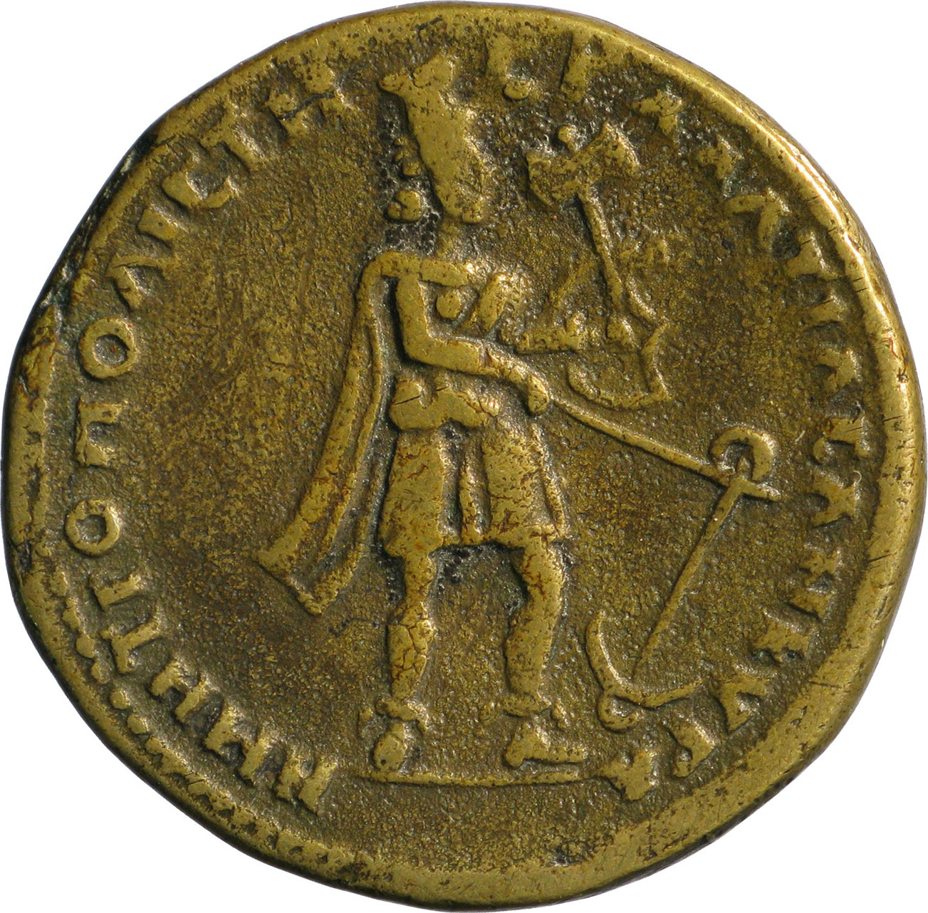 Amazon standing, right, wearing tall headdress, holding double axe, pelta and anchor |