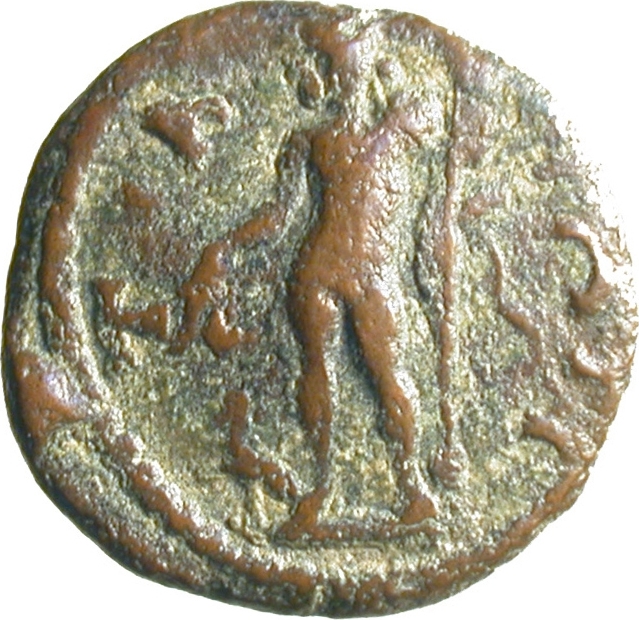 nude Dionysus standing, left, holding cantharus(?) over panther and long thyrsus