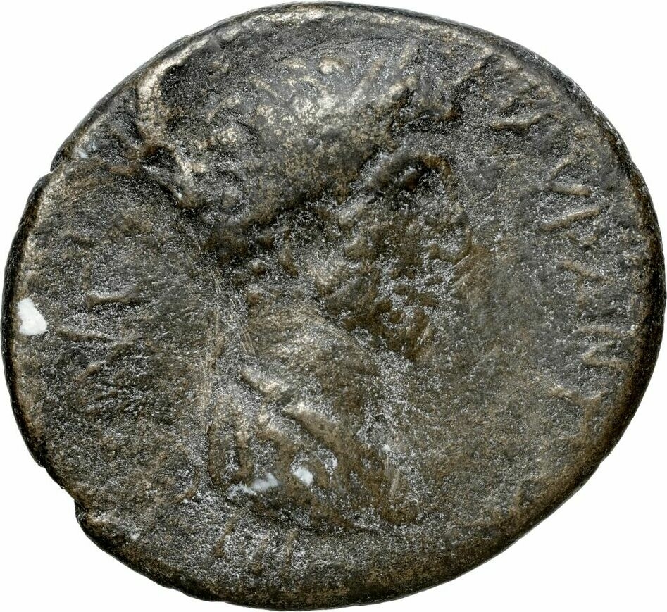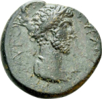 Tyche standing, left, wearing kalathos, holding rudder and cornucopia |