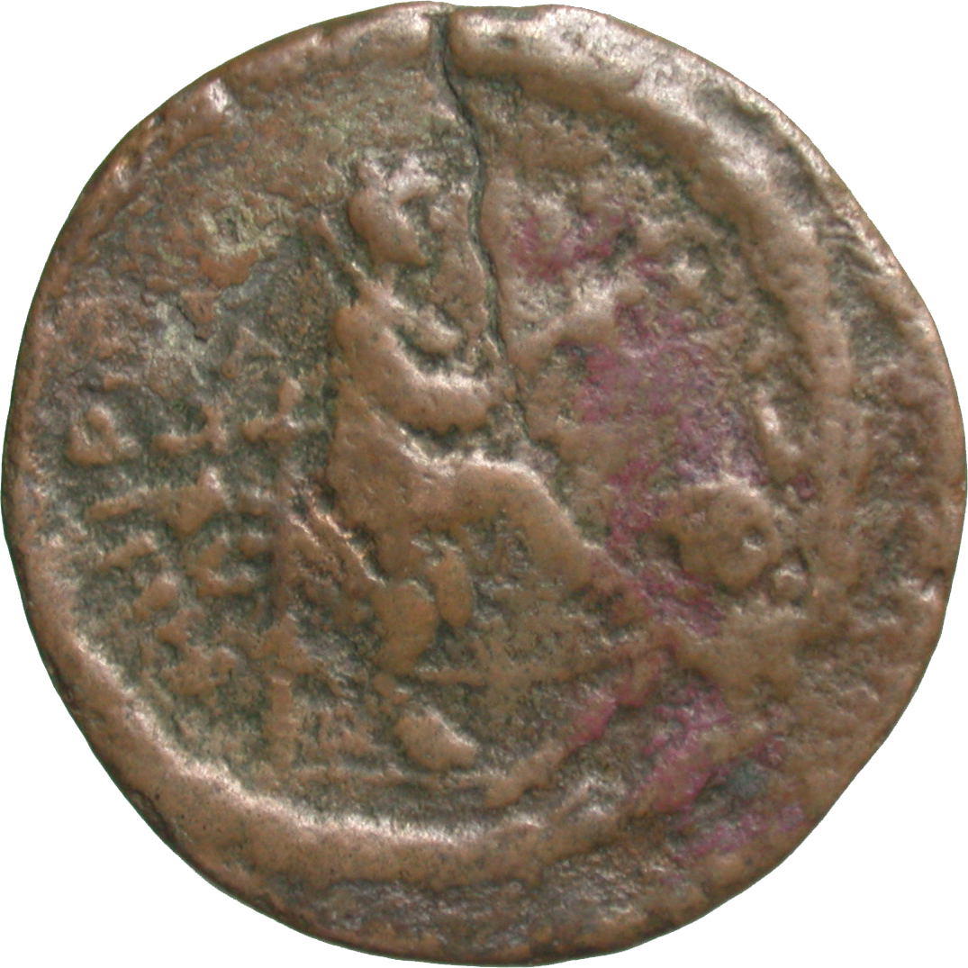 turreted and veiled Tyche seated, right, holding poppy and two ears of corn, resting foot on swimming river-god (Kydnos), wearing sedge; Tyche's seat decorated with sphinx; all in laurel wreath