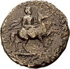 Caesar Marcus Aurelius galloping, right, wearing military dress, holding spear horizontally