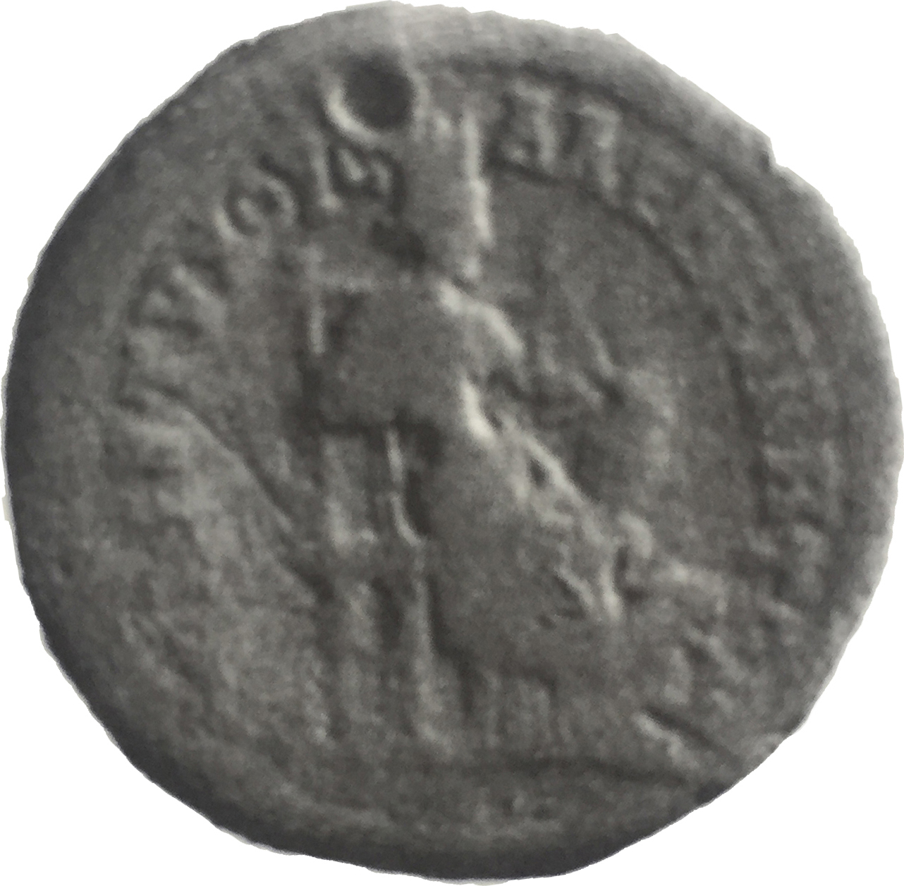 turreted Cybele seated, right, holding tympanum; to right at her feet, lion |