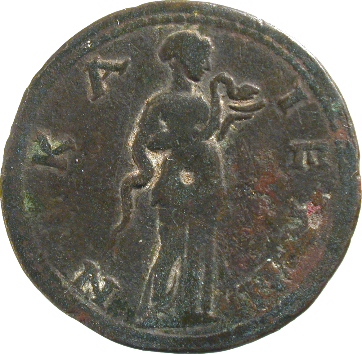 Hygieia standing, right, feeding serpent from patera