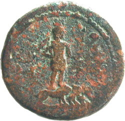 male Egyptianizing deity standing on base, facing, head, right, wearing kalathos, holding fail and long sceptre; at his feet, three lions standing, right
