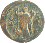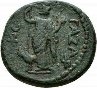 Tyche standing, left, wearing kalathos, holding long sceptre and cornucopia; to left, heifer standing, left; to right, Gaza-symbol (mem)