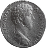 bare-headed bust of Marcus Aurelius (long beard with short curls) wearing cuirass and paludamentum, right, seen from rear