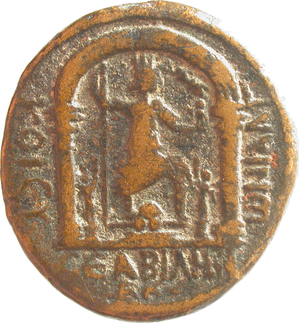 shrine with two columns enclosing statue of turreted Tyche standing, right, holding long sceptre and uncertain object; Tyche is crowned by Nike (on right) and rests foot on swimming river-god; group between two small figures on columns, extending arms |