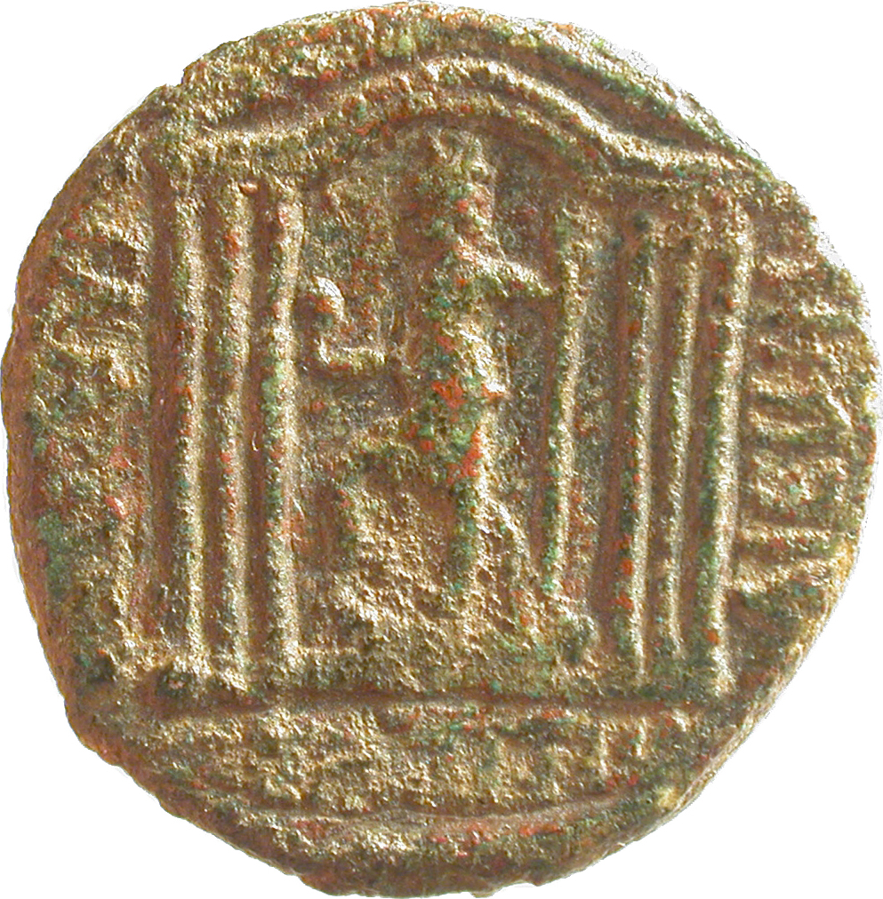 temple with six columns and rounded pediment enclosing statue of turreted Tyche-Astarte standing with foot on low base, left, holding human bust and long sceptre, resting foot on swimming river-god |
