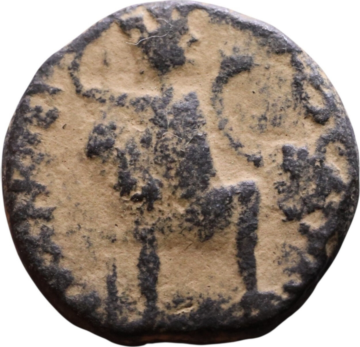 turreted Tyche standing with foot on prow(?), right, holding long sceptre and cornucopia