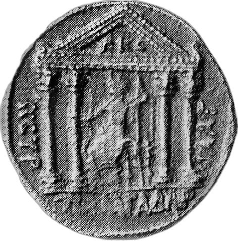 temple with four columns enclosing statue of Zeus seated, left, holding uncertain object (Nike or short filleted staff?) and long sceptre |