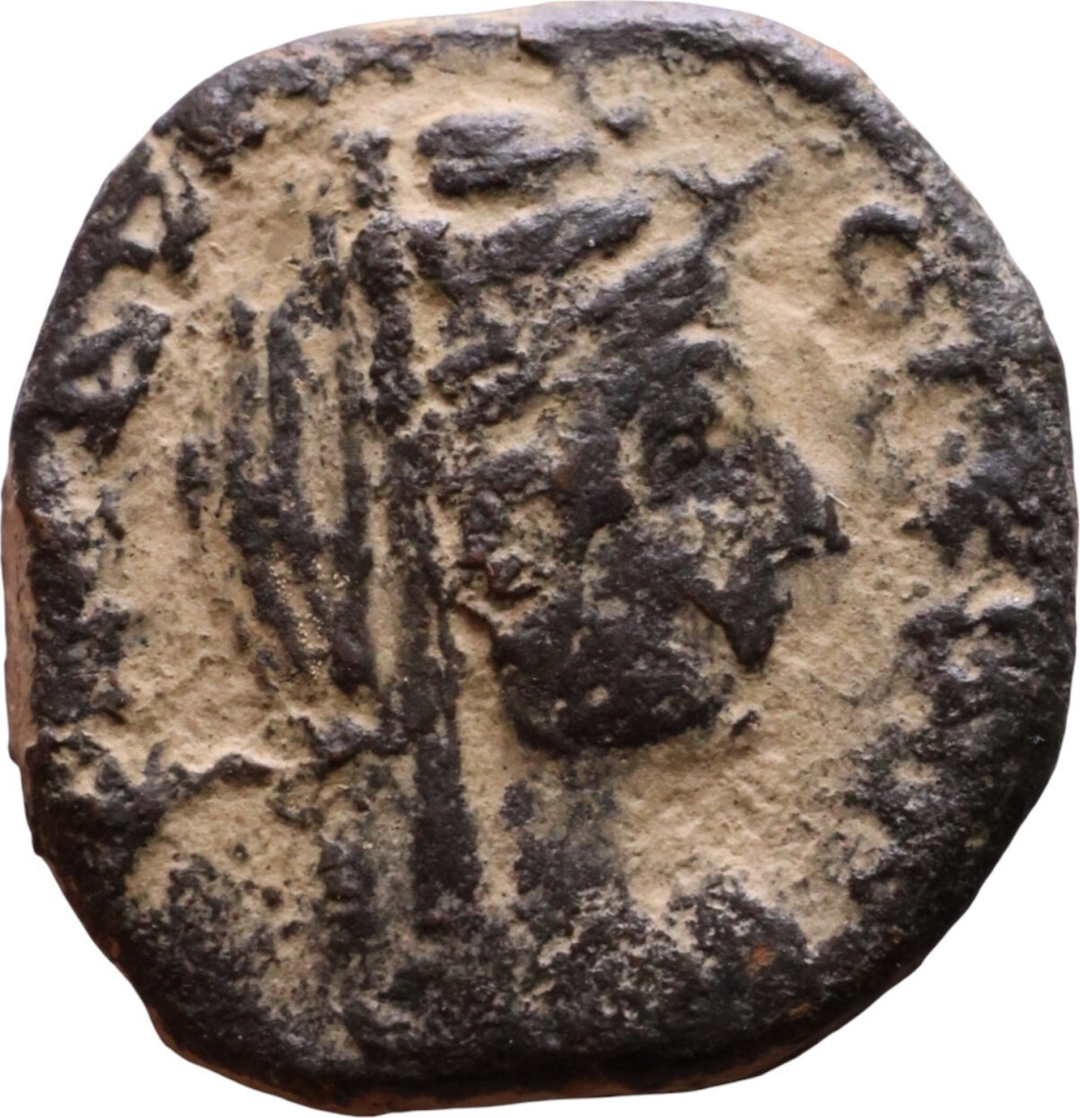 Kindler, Bostra 8(3)c, pl. 1 (on r.), with additional reverse legend variation: ΤVΧ[ ] ΗΛΙΑ[ ] (all retrograde) |