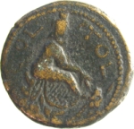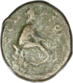 turreted and veiled Fortuna/Tyche seated on rock, right, holding ears of corn, resting foot on swimming river-god