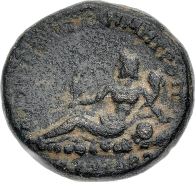 river-god Chrysoroas reclining, left, holding three ears of corn and cornucopia, resting on water-urn |