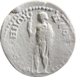 nude hero (Kyzikos) standing, left, chlamys over shoulder, holding spear