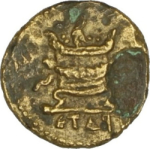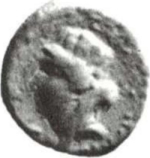turreted, veiled and draped bust of Tyche, left; below, ram running, left, head, right