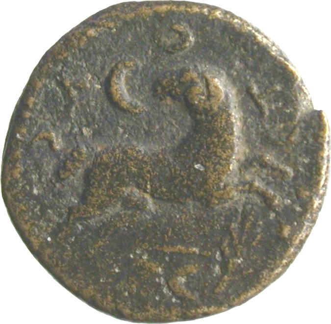 ram running, right, head, left; above, crescent and star (reduced to dot); to right, palm-branch