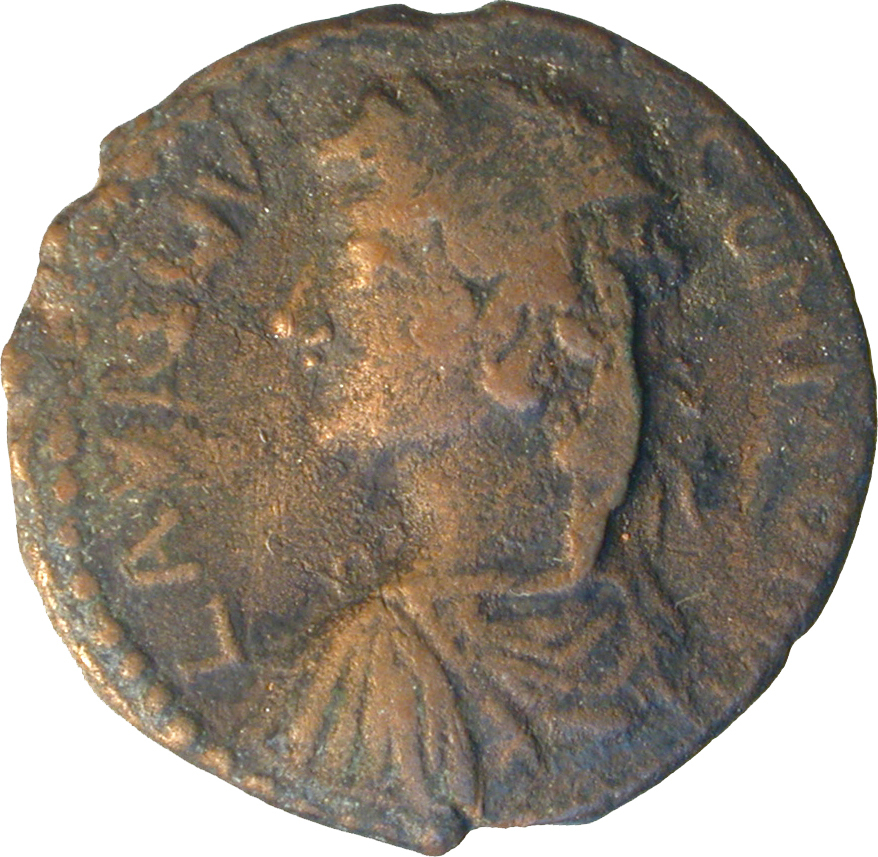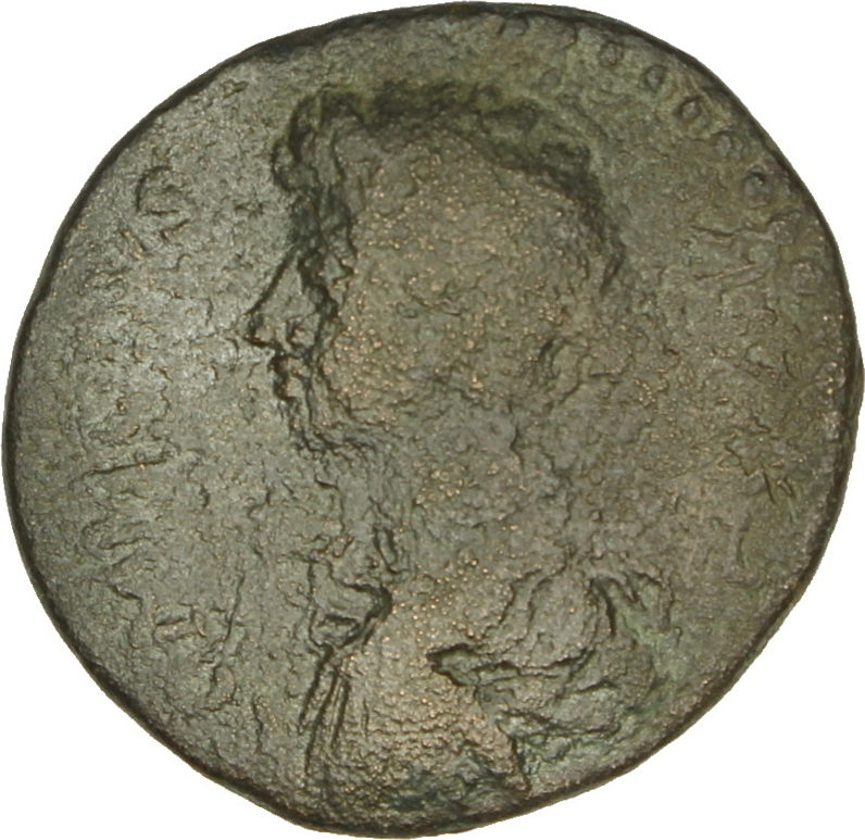 laureate-headed bust of Commodus (youthful) wearing cuirass and paludamentum, left