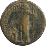 Genius standing, facing, head, left, emptying cornucopia over altar, holding long sceptre