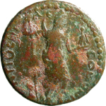 Mên standing with foot on bucranium, facing, head, right, wearing Phrygian cap, holding long sceptre and Victoria/Nike; behind his shoulders, crescent; to left, cock