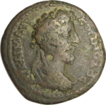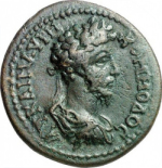 laureate-headed bust of Commodus (long beard) wearing cuirass and paludamentum, right, seen from rear
