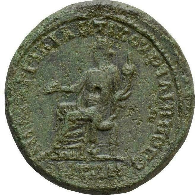 turreted Homonoia, seated, left, holding patera and cornucopia |