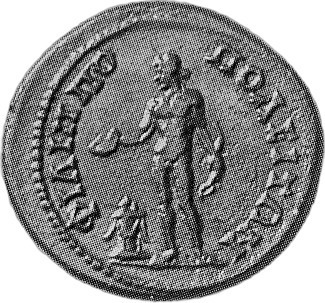nude Apollo standing, facing, head, left, holding patera over altar and uncertain object (bow or laurel-branch?)