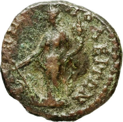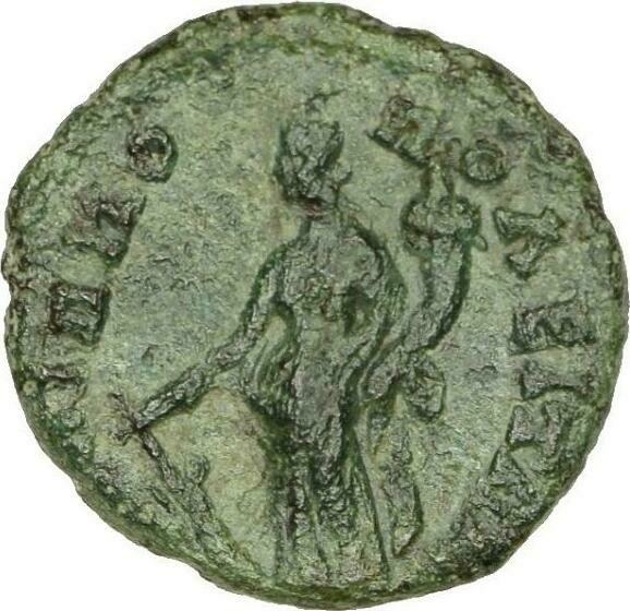 Tyche standing, left, holding rudder and cornucopia