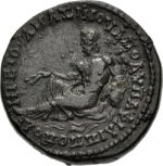 bearded river-god (Hebros) reclining, left, holding ears of corn and poppy, resting on vase from which water flows; behind, tree |