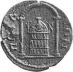 shrine with two columns enclosing statue of Artemis of Perge, facing, wearing kalathos; body decorated with three friezes of figures; on each side, flying figures crowning the statue