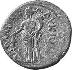 Tyche standing, left, wearing kalathos, holding rudder and cornucopia