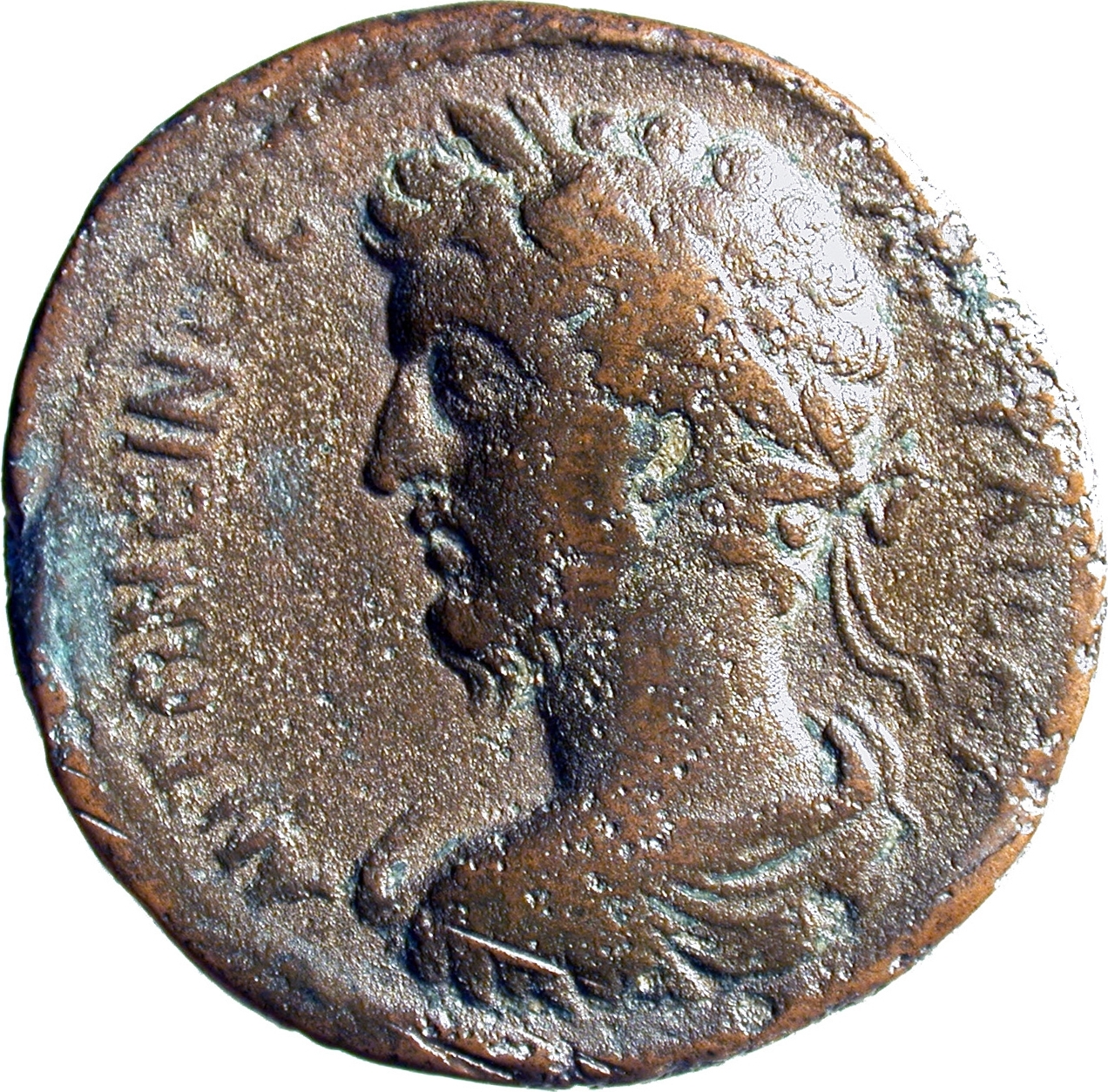 laureate-headed bust of Marcus Aurelius wearing cuirass and paludamentum, left