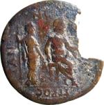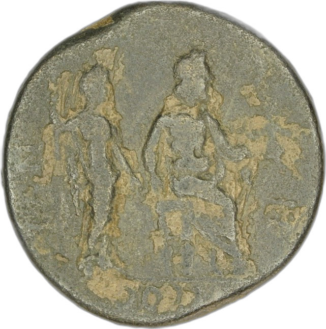 to left, Demeter standing, right, holding long torch and two ears of corn; to right, Zeus seated, right, holding Nike(?)