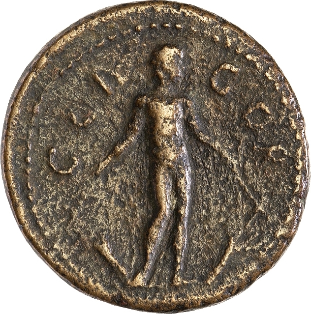 nude Isthmos standing, facing, head, right, holding rudder in each hand