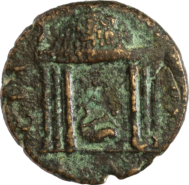 circular temple of Melikertes-Palaimon with dome-shaped roof decorated with two dolphins; building has six outer columns; inside, Melikertes-Palaimon lying on back of dolphin, right, and pine-tree; between two pine-trees