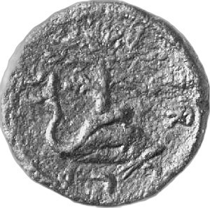 Melikertes-Palaimon lying on back of dolphin, right; behind, pine-tree