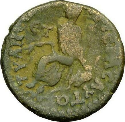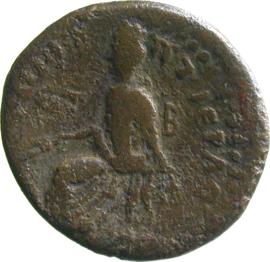turreted Tyche seated, left, holding ears of corn and bunch of grapes, resting arm on seat, resting foot on swimming river-god (Euphrates); Tyche's seat decorated with griffin |