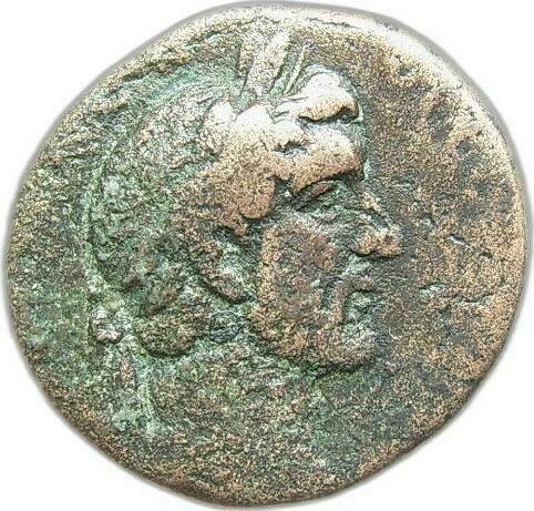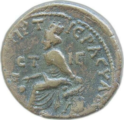 turreted Tyche seated, left, holding ears of corn and bunch of grapes, resting arm on seat, resting foot on swimming river-god (Euphrates); Tyche's seat decorated with griffin |