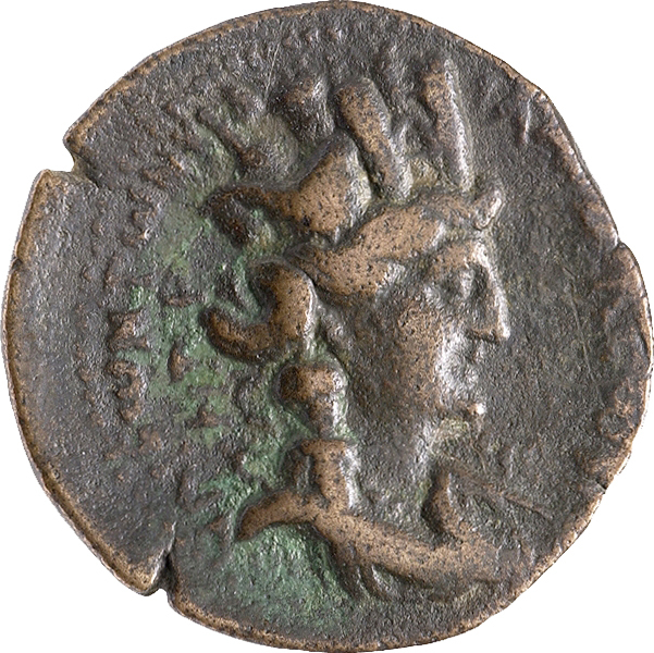 turreted and draped bust of Tyche wearing bunch of grapes, right