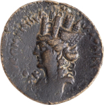 turreted and draped bust of Tyche wearing bunch of grapes, left