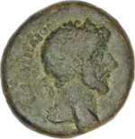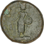 statue of Helioseiros standing on base, facing, head, left, holding palm-branch, round shield and spear; in lower right field, star |