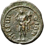 nude Harpocrates standing, left, wearing tall headdress, raising right hand to mouth, holding cornucopia and chlamys