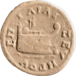 prow, right; on top, emperor standing on base, right, holding spear, extending left hand; (behind emperor, trophy); below, water (and dolphin)